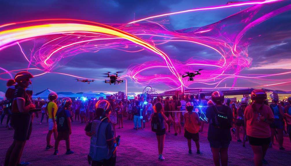 Attending a drone racing event offers a high-speed, adrenaline-pumping spectacle unlike any other sport. As a spectator, you can immerse yourself in the thrilling maneuvers and strategic navigation of high-tech drones as they zip through challenging obstacles. The magic lies in the first-person view (FPV) technology, which lets you feel like you're flying right alongside these racing marvels. This innovation transforms racing as a spectator sport, making it dynamic and exhilarating.