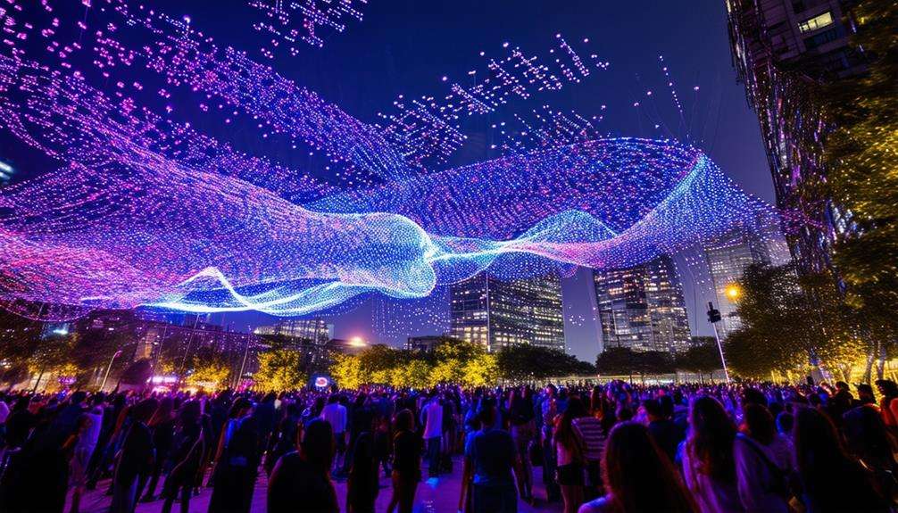 The interactive nature of drone art installations also fosters engagement. You're not just a passive observer; you become part of the artistic experience. This dynamic interaction encourages you to rethink how you experience art, pushing the boundaries of creativity and public space.